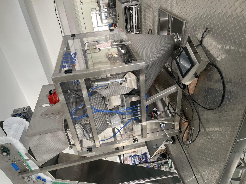 Deze eenheidsmachine is een speciaal ontwerp voor het verpakken van ijsblokjes en ijsbuis in een zachte plastic zak. Met functie van ijsblokjestoevoer, wegen, vullen, automatische zakvormende afdichting en volledige zakuitvoer. De hoofdmachine heeft de functie van zak tellen en datumcodering .