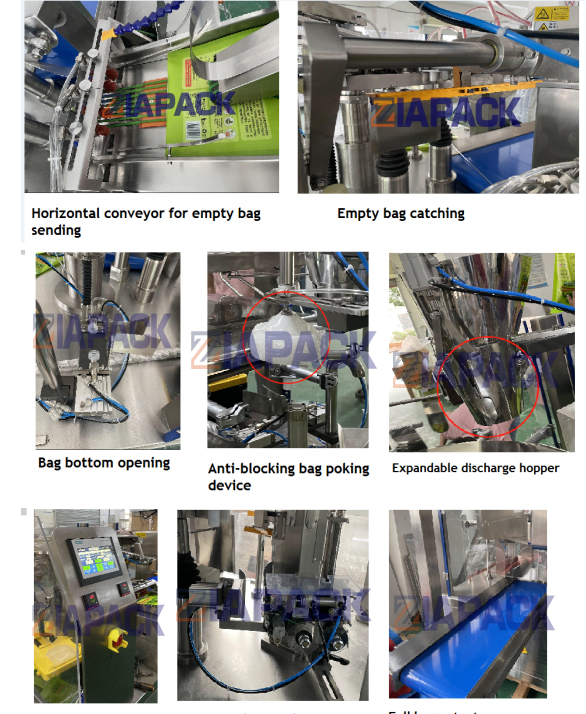 Rotatiezak-gegeven verpakkingsmachine met verschillende dosering (zoals multihead weger, avegaarvuller, vloeibare vuller enz.) kan geschikt zijn voor de automatische verpakking voor korrelig, poeder, vloeistof, pasta enz. Verschillende soorten product met de premade stand-up rits etui enzovoort.