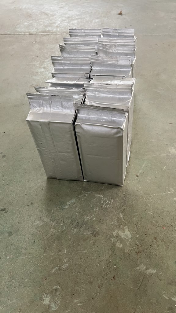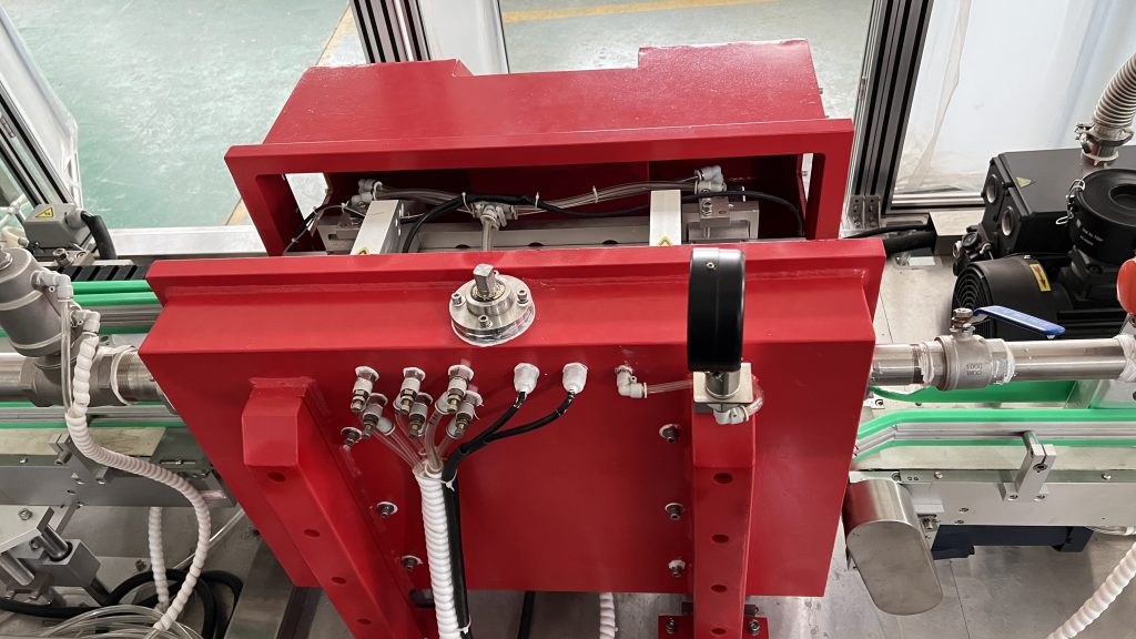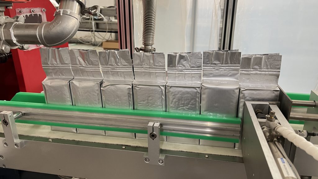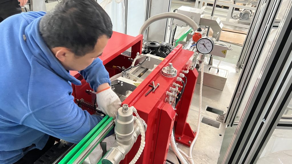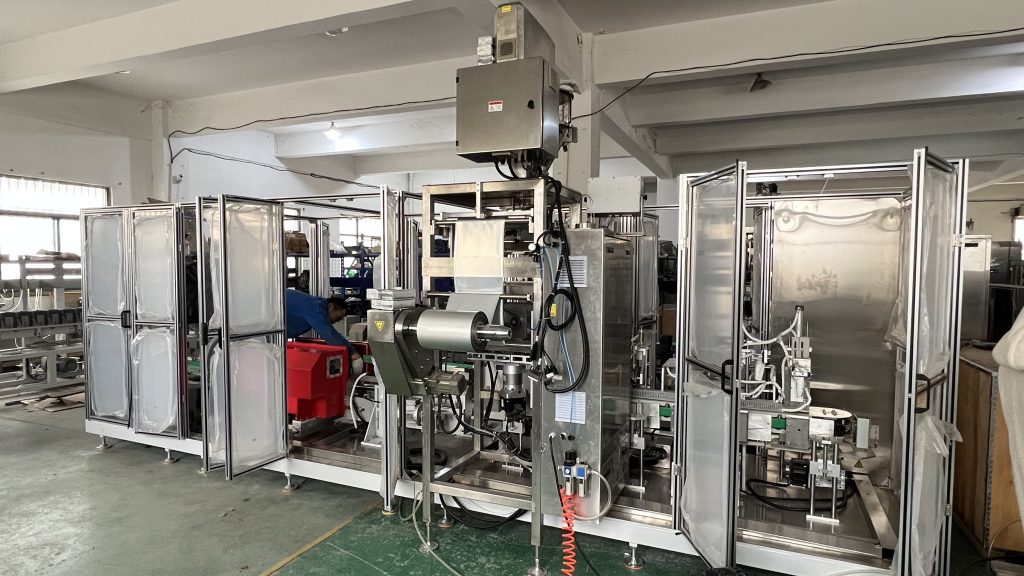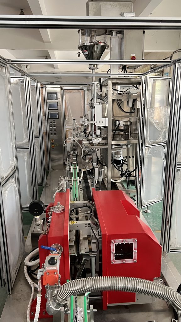 Onze klant uit Iran had een set automatische vacuümzakvormende vulverpakkingsmachines voor 250 gram koffiepoeder besteld. En volgens de eis van de klant hadden we de vacuümkamer rood geverfd als waarschuwing.