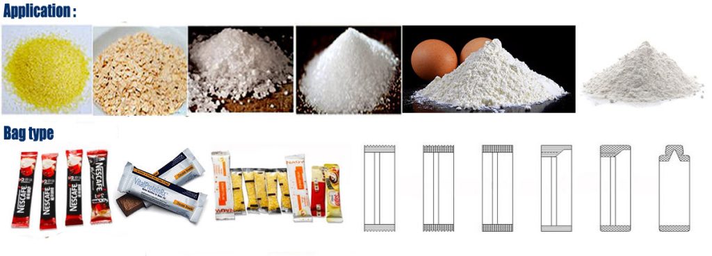 Deze machine wordt voornamelijk gebruikt om poederproducten te verpakken: zoals melkpoeder, melktheepoeder, koffiepoeder, specerijen, kerriepoeder, eiwitpoeder, kruiderij, kruidenpoeder, chemische en medische poederproducten.