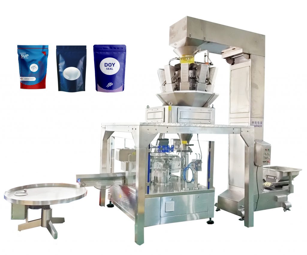 Pre-made pouch vul-en sluitmachine, samengesteld uit 8 werkstations van efficiëntie en stabiliteit, benadrukt het pakket van stand-up tas, rits zak, spuitzak, en verschillende pre-en-klare pouches. Samengewerkt met verschillende doseersystemen (combinatie weger / lineaire weger / vijzelschroef / pistonvuller) en automatische hijstransporteurs, wordt het op grote schaal toegepast op korrels, vloeistof en poeder.